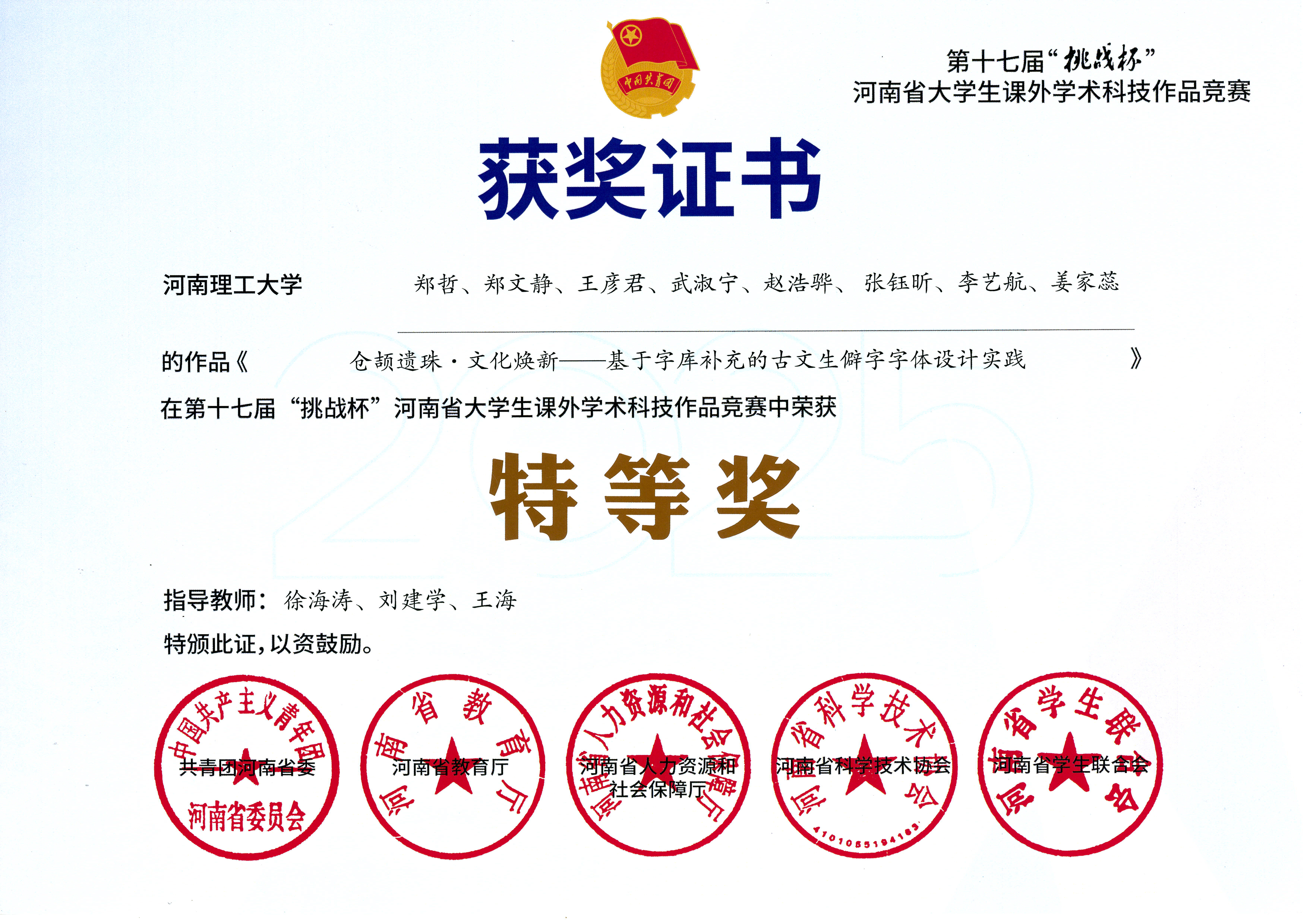 近日,第十七届“挑战杯”河南省大学生课外学术科技作品竞赛揭晓,我设计学研究生团队凭借作品《仓颉遗珠·数字激活——基于字库补充的古文生僻字字体设计实践》摘得省级特等奖。